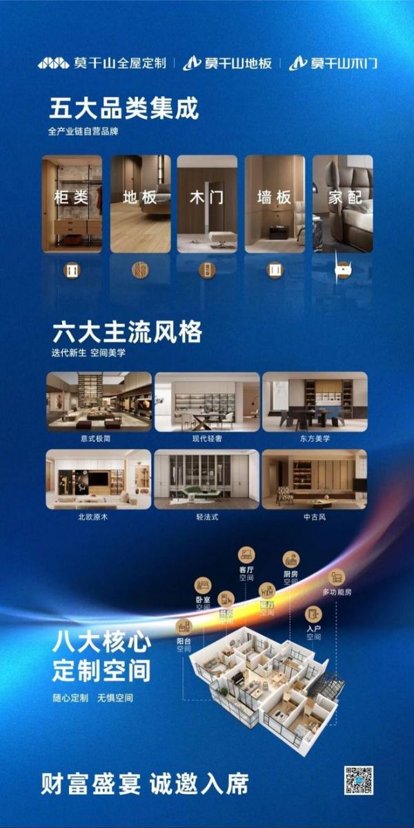 当前,市场同质化严重,莫干山大家居持续深耕“轻高定”实木细分市场,以 “全品类 + 多年实木基因” 构建差异化壁垒;打造门、墙、柜、地、配五位一体整家体系,涵盖八大空间(客厅、卧室、餐厨等)、六大风格。