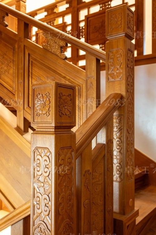 缅甸柚木楼梯形制精巧,将军柱威严伫立,小立柱玲珑生姿,裙板上花鸟山水翩然欲活。扶手与立柱衔接自然,整体木色温润厚重,搭配背景中的格栅花窗,将中式雅致与空间的奢华感相融,每一处纹样都藏着东方美学的细腻韵味。