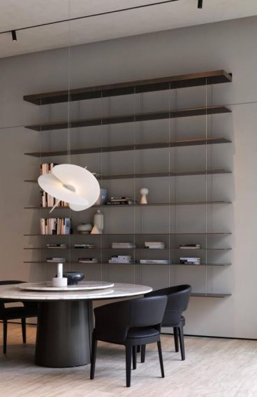 Sincro推拉门与Dada Engineered Prime厨房系列流畅衔接。Dada Engineered研发部门精心打造的Prime厨房旨在迎合客户对至臻美学的追求。空间由此向用餐区延展,Patricia Urquiola设计的Diamond餐桌以精妙的折纸艺术语言呈现弯曲的桌腿,尽显优雅韵致,与Arik Levy符合人体工学的当代Outline餐椅相得益彰。