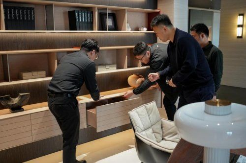 北新木业团队先后参观了科凡四大主题展厅。工程展厅的交付实力、310㎡高定展厅的美学表达、250㎡大平层展厅的色彩演绎,以及150㎡木纹系列展厅的自然质感,让嘉宾直观感受“颜值与功能共生”的产品理念。针对双方合作的“博耐克欧松板”应用效果,北新高管细致探讨适配性与落地表现,对产品品质频频称赞。