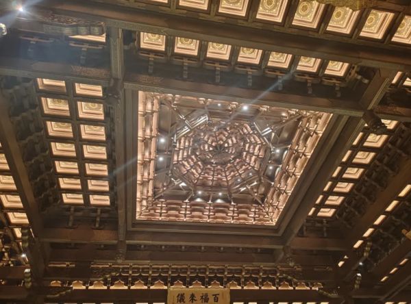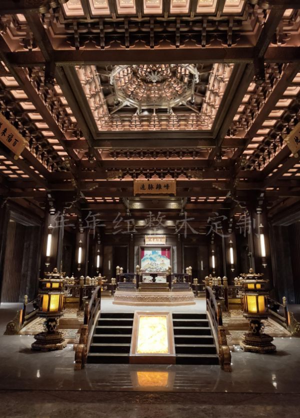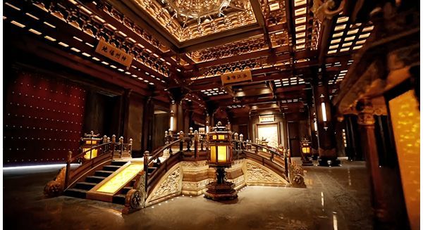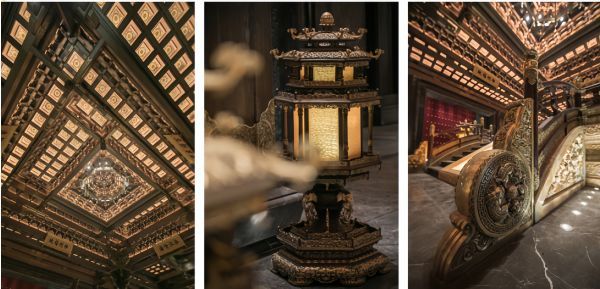 藻井华章,光影叙事:吊顶严格按皇家宫殿中式藻井制式设计,结构繁复精巧,不仅承载着中国古建筑中“天人合一”的哲学观念,更成为空间的精神穹顶。这一木作杰作,配合荣获2023年亚洲照明设计奖的照明系统,使得光线在藻井的层层格栅与雕花间流转倾泻,营造出庄严、神秘而又温暖的光影氛围,让现代照明科技与传统木结构之美相得益彰。