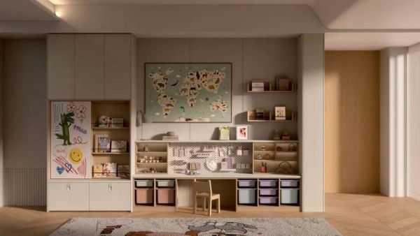 专为激发孩子想象力与创造力而设计,整合了涂鸦区、读物区与玩具收纳区。通过上翻书架、抽拉收纳篮、洞洞板墙面及定制靠背收纳等多重方式,巧妙解决育儿家庭玩具、书籍杂乱无章的痛点,让一切物品井然有序,让孩子在游戏中学习,在探索中成长。