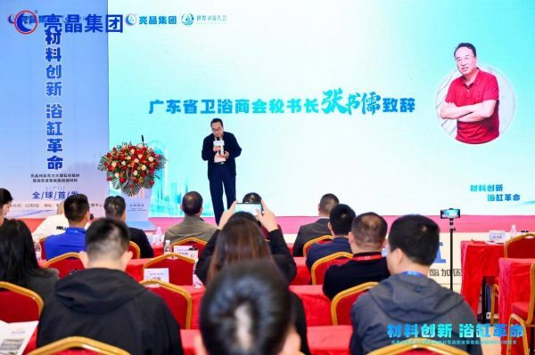 亮晶集团董事长王钧、广东省卫浴商会秘书张书儒、广东省卫浴商会材料专委会主任李建勤、意大利米兰设计师俱乐部中国华南区秘书长焉莫、新卫浴网总经理江彩霞、卫浴新闻总经理高声伟等行业嘉宾,以及粤华卫浴董事长黄福华、粤华卫浴总经理黄杰森、德尚卫浴董事长邹逸、新泰和卫浴董事长梁健康、富丽斯洁具董事长霍灌南、埃飞灵常务副总裁龚学文、西沃卫浴总经理钟志龙、贝加特卫浴总经理钟天刚、尚雷仕卫浴总经理冉军、汇康卫浴董事长倪伟、天滢卫浴总经理张伍妹、森堤亚卫浴总经理张雪、派瑞斯卫浴总经理卓新明、汉威卫浴总经理冯勇胜、德沃卫浴总经理黎裔全、健之杰卫浴总经理麦海连、威纳斯卫浴总经理汤文新、蒙娜丽莎卫浴董事长丁伟刚、广顺卫浴总经理云小姐、赛高卫浴总经理龙忠贤、沃尔特卫浴总经理李嘉赞、艾丽卡卫浴总经理林强、恒洁卫浴胡广丹、九牧卫浴袁总、亚太建材总经理王森民、圣罗兰卫浴常总、洛美洁具熊总、戈兰迪新材料肖美玲、奥丁卫浴总经理代凯军、欧斯露总经理何总、隆力达洁具总经理徐建峰、柯伊赛总经理马明库、澳克利亚卫浴总经理张建明、浴健洁卫浴总经理陈家环等三百余家浴缸生产企业代表齐聚一堂,共同见证了这一行业革命性时刻。