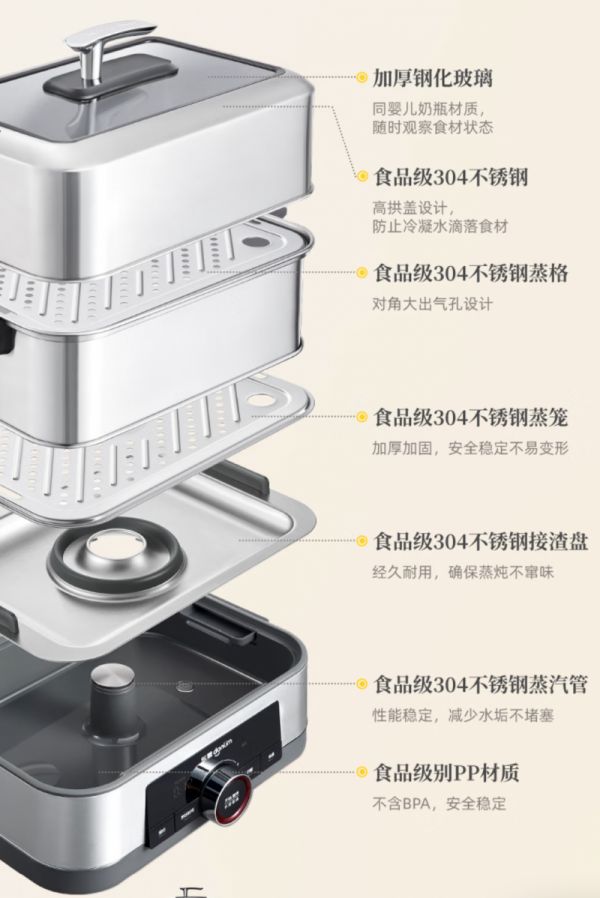在材质选择上,东菱电蒸锅严格把关,蒸汽接触面采用全食品级304不锈钢材质,导热性能强受热更均匀,不含双酚A,蒸菜烹饪过程杜绝了有害物质的析出,同时,不易藏油污清洁更省心。