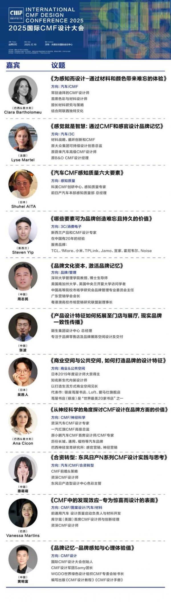 此次大会迎来众多重量级嘉宾、领导出席,部分包括:国际CMF设计大会组委会专家,南京艺术学院.工业设计学院.原院长李亦文教授;国际CMF设计大会组委会专家,广州美术学院.工业设计学院.原院长陈江教授;国际CMF设计大会组委会专家,深圳市工业设计协会执行会长刘振先生;深圳市工业和信息化局消费品工业处副处长、二级调研员周行椿先生;广东省工业设计协会.副会长周红石先生;国际CMF设计奖评委,材料专家邱耀弘博士;国际CMF设计奖评委,北京服装学院教授色彩专家崔唯教授;国际CMF设计奖评委,华中科技大学设计学院.副院长曹淮教授;国际CMF设计奖评委,湖南大学设计艺术学院教授张军教授;国际CMF设计奖评委,武汉大学城市设计学院教授楚东晓教授;光明区文化广电旅游体育局四级调研员钟鸿志先生;市工业和信息化局消费品工业处一级主任科员顾浩先生;深圳大学管理学院周志民教授;迪拜PEEC首席色彩与材料设计师Clara Bartholomeu女士;法国资深CMF设计专家Lyse Martel女士;一汽红旗CMF高级总监Ana Franco女士;新西兰产品与CMF设计专家Steven Yip先生;东风日产造型设计中心色彩主管惠萌萌女士;科美CMF创研中心感知质量专家Shuhei AITA先生;朗生集团设计中心总经理张波先生;日本知名新生代内装设计师吴胜人先生;国际CMF设计大会创始人黄明富先生。