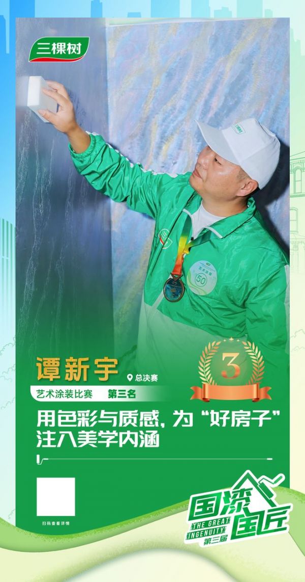 近日,2025三棵树“国漆国匠”全国建筑涂装职业技能总决赛在福建莆田圆满落幕。专注于艺术涂装领域的谭新宇,凭借对色彩与材质的敏锐感知、对健康人居的执着追求,在艺术涂装赛项中斩获季军。他让每一面墙不仅赏心悦目,更成为承载家庭记忆、呵护居住健康的诗意空间——这也正是当下“好房子”战略所倡导的,从建筑本质回归健康、舒适与美学的居住内涵。赛后,我们与谭师傅展开深度对话,聆听他如何通过一笔一刷的色彩与质感营造,助力业主实现心中理想的“好房子”。