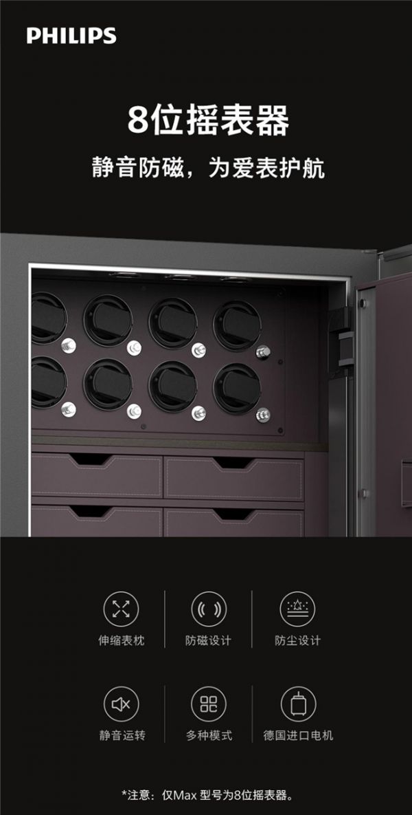 对于腕表收藏爱好者而言,Valis Max型号搭载的8位专业摇表器,堪称“收藏级腕表的专属养护舱”。采用德国进口电机,运转稳定精准,能模拟人体日常活动的摆幅与频率,为自动机械腕表持续补充动力,避免因长期静置导致机芯停摆、润滑油干涸,延长腕表使用寿命。
