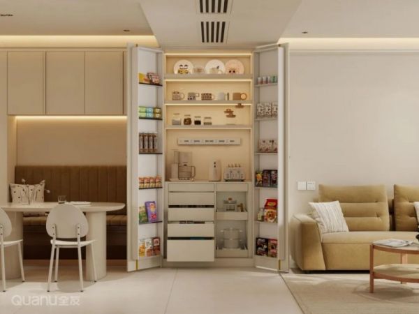 1㎡不到的面积,却能集水吧台、零食柜、电器收纳于一体,不仅是高效的收纳系统,更是家庭能量补给站~