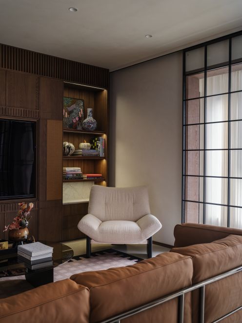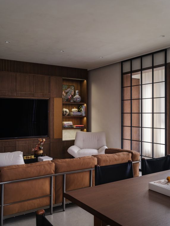 整体起居与餐厨空间呈现温润馥郁的胡桃木色调,带来如同一杯手冲咖啡带来的醇厚气息,营造出细腻而富有温度的生活底色。
