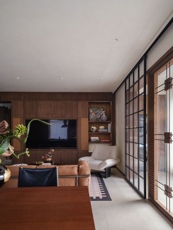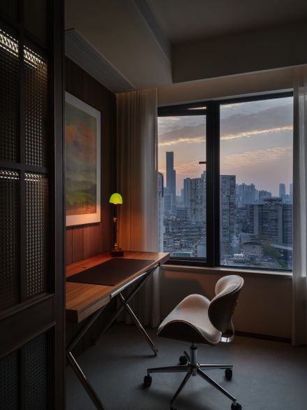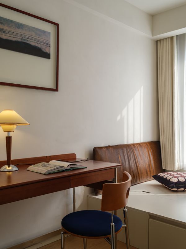 窗前可移动挡板的设计,是对“视野”这一概念的精准回应,它既调节光影与通风,也让居者拥有对空间情绪的主动权。当挡板移开,窗景成为生活的一部分;当它合上,室内便获得一个完整而安定的视觉背景。