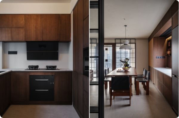 厨房以一道联动门定义其“可开可合”的状态。当门关闭,烟火气被妥善收纳,当门打开,烹饪则自然融入家庭交流之中。餐厅一侧延展出的西厨柜,悄然补充了操作与储物机能,使空间在有限尺度中仍保持从容。