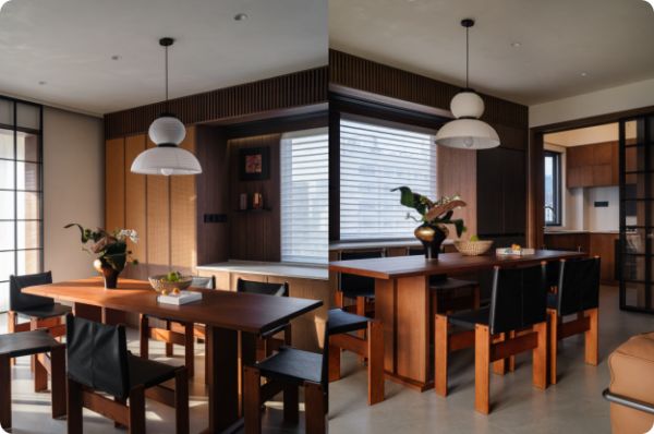 设计并未急于“打开”空间,而是先重建秩序。入户处,一道轻盈的屏风成为视觉的缓冲层,如同一句尚未说完的话,在动线与光线之间留下恰到好处的停顿。它既回应传统风水中的尺度感,又以更当代的方式,保留了空间的通透与延展。