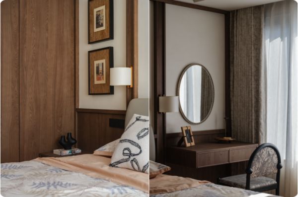 主卧延续公共区域的木质基调,却在比例与触感上更为内敛。到顶柜体与墙面形成一体化界面,线条利落却不显冷硬。同时弱化装饰性细节,强调长期使用的舒适度与秩序感。
