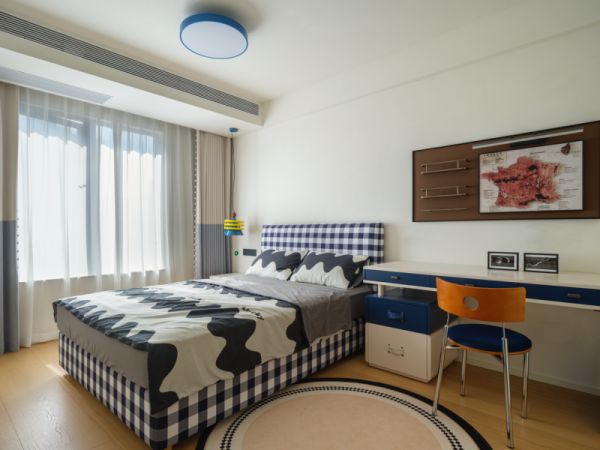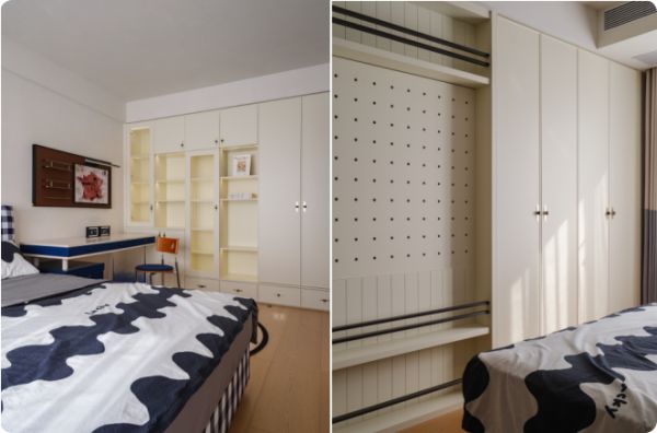 设计师并未将儿童房定义为某一年龄阶段的专属场景,而是试图构建一个可随成长而演变的日常容器。整体空间以蓝白色调为主,保持明亮与开放,世界地图、洞洞板与模块化收纳系统共同构成一个可调整的使用框架。