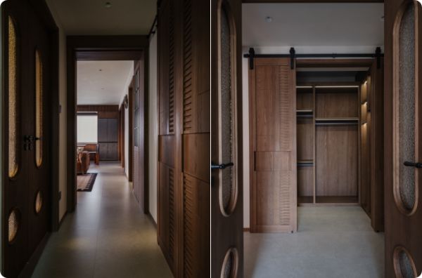 卧室与衣帽间之间的双面收纳墙体,以原木与玻璃的组合实现高效整合。深色木质赋予空间稳定而成熟的气质,让功能区亦具备审美完整性。