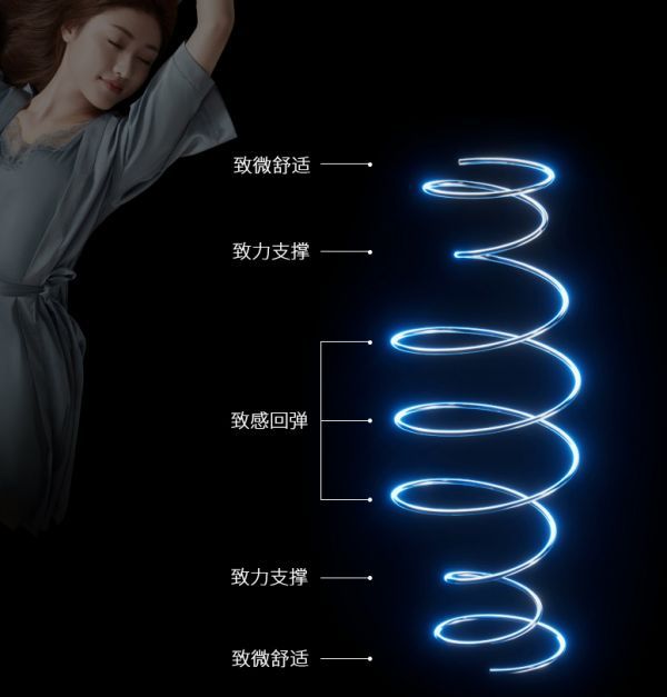 床垫的核心弹簧系统更具巧思,采用双灵敏源陀螺回旋设计,端部至中部呈现先收窄再舒展的陀螺回旋形态,一举覆盖舒适承托、弹性回弹、稳固支撑三大睡感维度。睡感层层递进、步步深入,助力身体持续维持循环深睡状态,让深睡时长有效延长,真正实现躺下即放松,入睡即深睡。