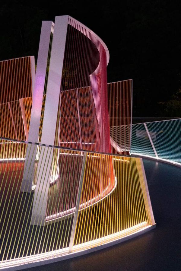 另一大设计亮点是灯光系统:声音化作振动,由内而外传递,激发场域内五感的丰富感知。装置精准捕捉环境节奏与变化,随之实时灵动地起伏、闪烁、跳动。