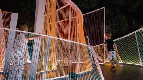 为呼应设计上海“无边界乐园”主题,我们从童年游戏汲取灵感,为装置注入灵动互动性与趣味性,以动态光影、流线捕捉烟火绽放瞬间的绚丽。这既是对童年记忆的深情召唤,更是重塑观众与城市空间情感联结的纽带。