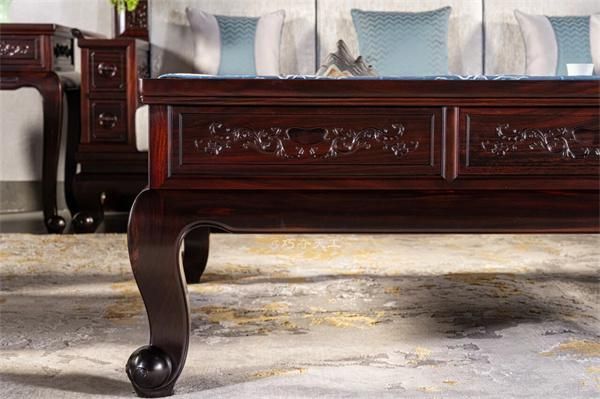 扶手外侧精雕牡丹卷草纹,线条婉转流畅,寓意富贵延绵不绝;外翻龙珠腿线条灵动流畅,为整体增添了几分雅致活力,让古典韵味在现代空间中自然流淌。
