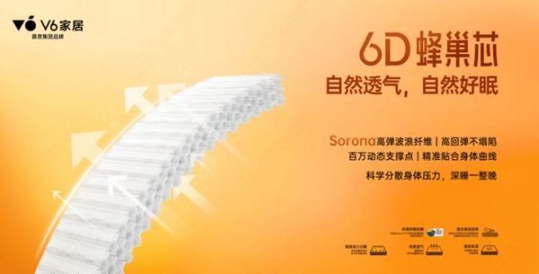 深入研究如何睡的科学不难,但将理论转化为实际产品、打造产品核心竞争力,正是V6家居一直秉持的钻研精神和过硬研发实力。V6家居一直聚焦从睡眠系统到核心材料共同打造健康睡眠体验,6D蜂巢芯产品,是再启支撑科技的新篇章。