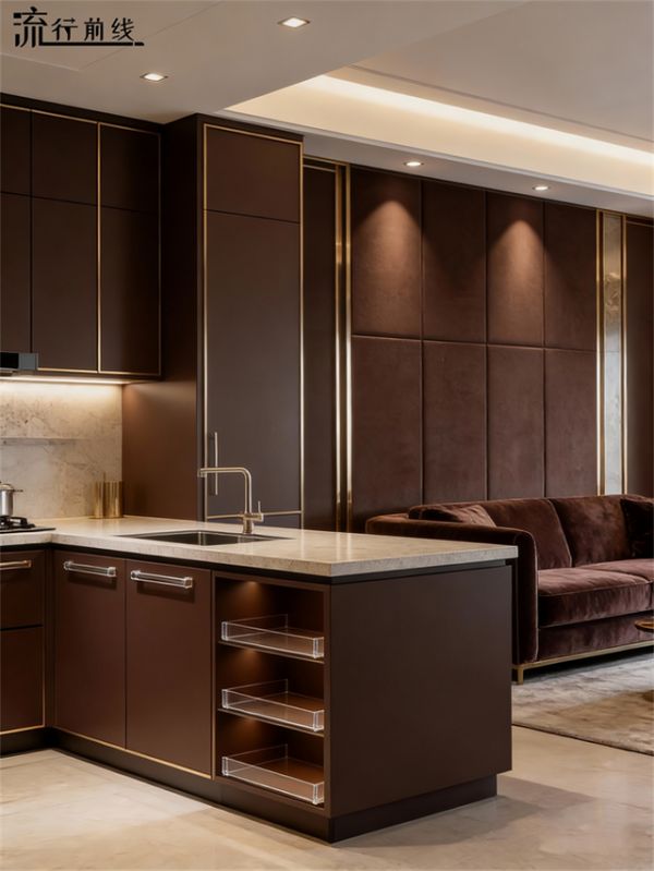 深灰与深棕色主导的色调,如墨色晕染,彰显出庄重与高贵,金色元素巧妙点缀于柜体边框与拉手之间,似星光落于肌理,成为空间的点睛之笔。