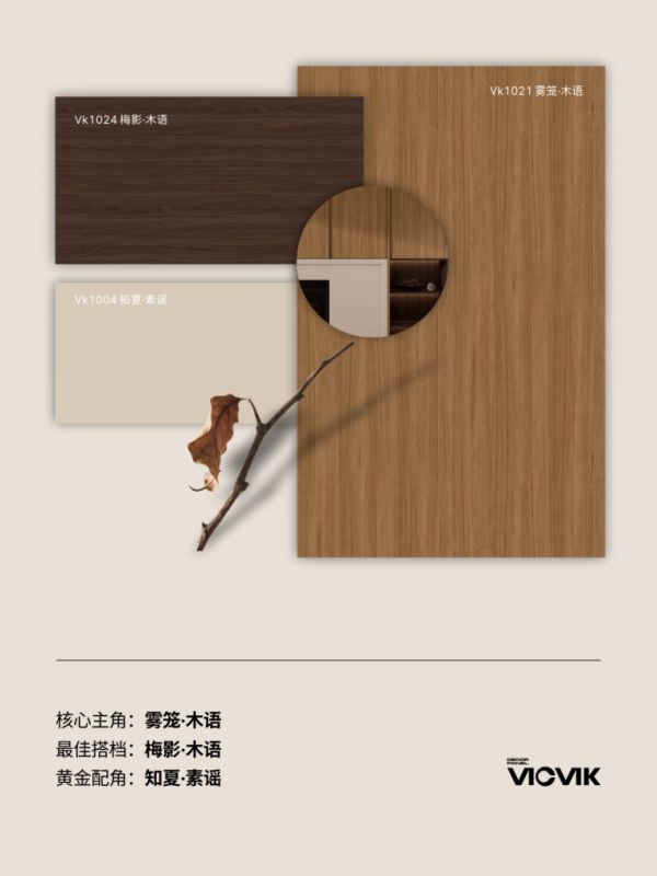VICVIK威克美学饰面板以“聆听自然的低语,感受岁月凝练的侘寂之美”为设计内核,深谙侘寂风对自然、原生、温润质感的追求,将自然材质的肌理与时光的沉淀感凝练成可触摸的家居饰面,让寻常居所成为藏纳安然与静谧的角落。其中,VK-1021雾笼·木语作为系列主推花色,成为打造侘寂风空间的核心主角,该花色隶属麦芒色系,拥有独特的涩触质感与直纹木纹,完美萃取胡桃木的天然肌理,将时光的醇厚融入饰面细节,不仅能撑起侘寂风的纯粹底色,更能兼容轻中式、中古、意式、侘寂等多元家居风格,适配不同的家居设计需求,为空间赋予老木沉淀的温润触感。