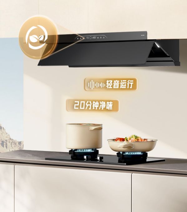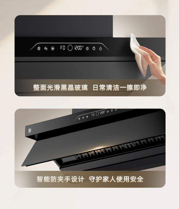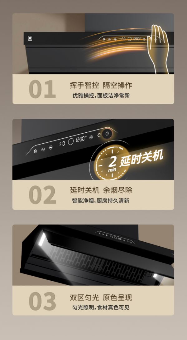 375mm超薄机身,有效节省吊柜空间,亦可自由嵌入多样风格的橱柜,提升厨房的整体美感;挥手智控的隔空操作,避免烹饪时油污沾染面板,让操作更优雅、便捷;2分钟延时关机的功能,智能净烟,让余味尽除,让厨房空气长久清新。
