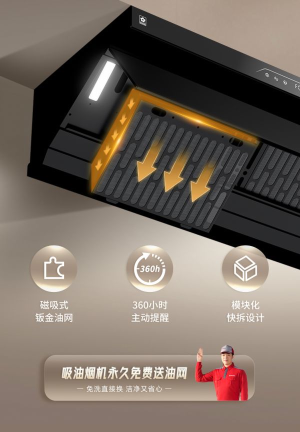 在清洁维护上,樱花吸油烟机K602更加贴心周到:吸油烟机滤网可享受永久免费更换的服务,从源头减少油污堆积对吸力的影响;磁吸式钣金油网与模块化快拆结构的设计,让拆装更轻松便捷,配合360小时智能提醒,更换周期清晰可控,确保吸力长期稳定。