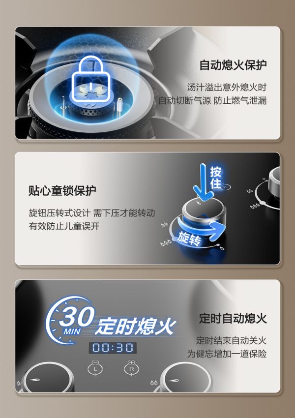 多重安全防护,让厨房更安心。樱花燃气灶 S510G 内置完善的安全保护系统:自动熄火保护,可在意外熄火时迅速切断燃气,防止燃气泄漏;旋钮压转式的童锁保护设计,有效避免儿童误触点火带来的安全隐患;更有30分钟定时自动熄火功能,即使忙碌忘记关火也能自动关闭。多重守护层层加持,时刻守护家人的安全,让每一次烹饪都更加从容。