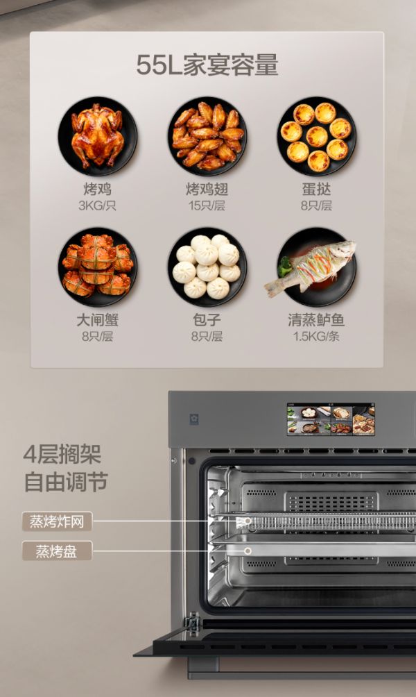 樱花蒸烤箱C5502A拥有55L家宴级大容量,四层可调节搁架可根据食材大小自由组合,无需分批烹饪,一次出炉即可满足全家胃口,周末家宴、节日聚餐,都能轻松呈现丰富美味的餐食享受,让烹饪效率翻倍,家人幸福感满满。
