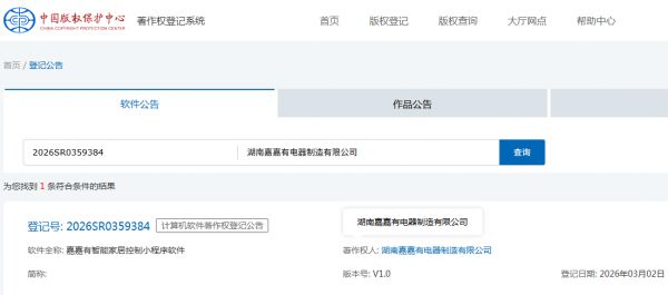 近日,“嘉嘉有智能家居控制软件V1.0”正式完成国家版权局著作权登记,登记号为2026SR0359384。该软件由湖南嘉嘉有电器制造有限公司研发团队独立开发完成。