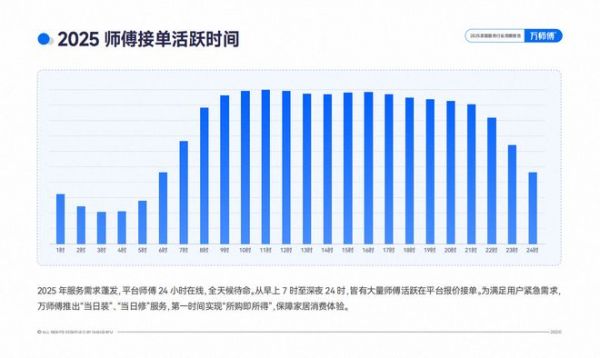 较往年相比,平台师傅活跃时间发生明显变化,24小时皆有师傅在线接单。这也从侧面反映出消费者下单时间几乎贯穿全天。