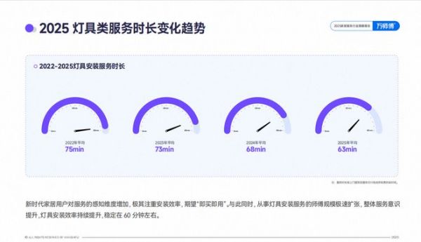 与此同时,从事灯具安装服务的师傅规模极速扩张,整体服务意识提升,灯具安装效率持续提升,稳定在60分钟左右。当今家居用户对服务的感知维度增加,极其注重安装效率,期望“即买即用”。