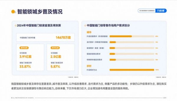 与此同时,我国智能锁城乡普及率存在显著差异,城市智能锁普及率高达33.87%,而县域及乡镇市场渗透率仅为5.87%,城乡需求梯度明显。