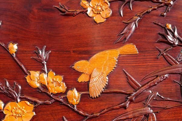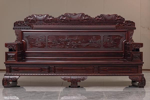 古森红木产品《栖云沙发》,以木色层次精雕花鸟