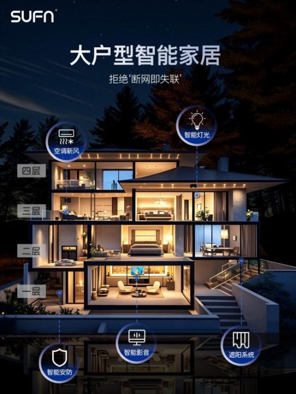 三峰全屋智能家居系统的核心优势体现在极致的稳定性。不同于行业常见的集成第三方系统的模式,三峰完全自主掌控底层代码逻辑,行业首发去网关跨楼层方案,告别“断网即失联”的尴尬,极端情况下单设备故障不影响全局运行。针对别墅大宅大空间、多设备的使用场景,SUFN OS系统可稳定支持上百台智能设备的同时联动响应,攻克大户型控制难题。