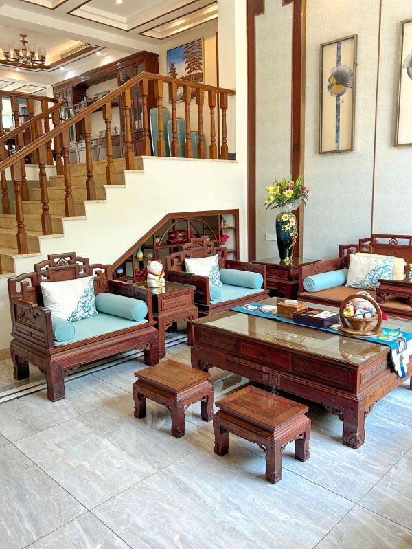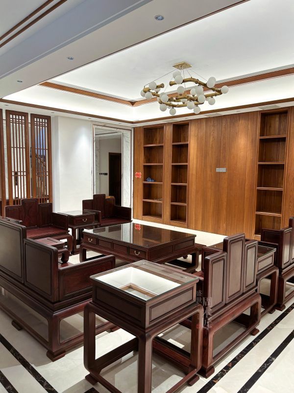 传统红木消费以单品家具为主,在别墅大宅中容易出现风格割裂、比例失调。红木整装的设计逻辑是“从空间出发”:设计师将客厅、餐厅、卧室、书房、茶室视为整体,统一规划护墙板、垭口、楼梯、隔断、柜体及活动家具的材质、色系与造型。新古典风格在此体系中,避免了古典的沉重感,使空间气韵流畅连贯。