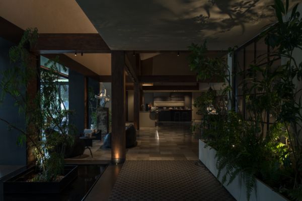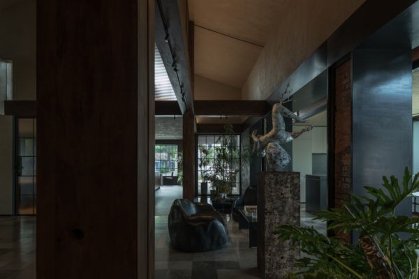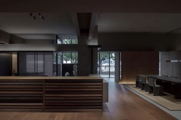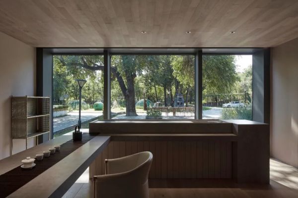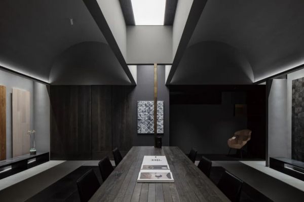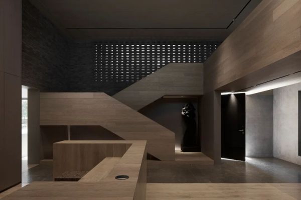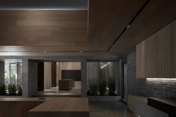 这份对“真实性”的坚持,在他的一系列展厅作品中一以贯之。2019年的木秀合集展厅,他选择让木地板不再是整齐罗列的展品,而是成为空间的结构本身。在孙河52号院那栋与一棵老树为邻的建筑里,他用实木、青砖、黑钢与清水混凝土共同构建了一套“材料现象学”:木的纹理在时间里留下使用痕迹,黑钢板自然氧化的纹路如蚀刻画一般,户外地板从室外台阶一路延展至室内接待处,模糊了内与外的边界。“矛盾与冲突总是有记忆的,惯性的思维会让设计变得平庸。”而他的方法,是让材料自己说话——在行走中被摩挲,在光影里呼吸,与每一个到来的人产生关系。