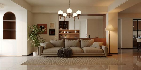 客厅作为家庭的核心社交场景,以“中古风松弛感核心社交区”为主题,在复古与松弛之间取得平衡,满足会客、休闲与审美表达等多重需求。墙面以暖米色乳胶漆打底,搭配胡桃木半墙隔断与奶咖色布艺沙发,形成柔和而富有层次的色彩关系。地面通铺浅米色瓷砖,并辅以编织地毯,不仅提升了空间明亮度,也为空间增添温暖而舒适的脚感。
