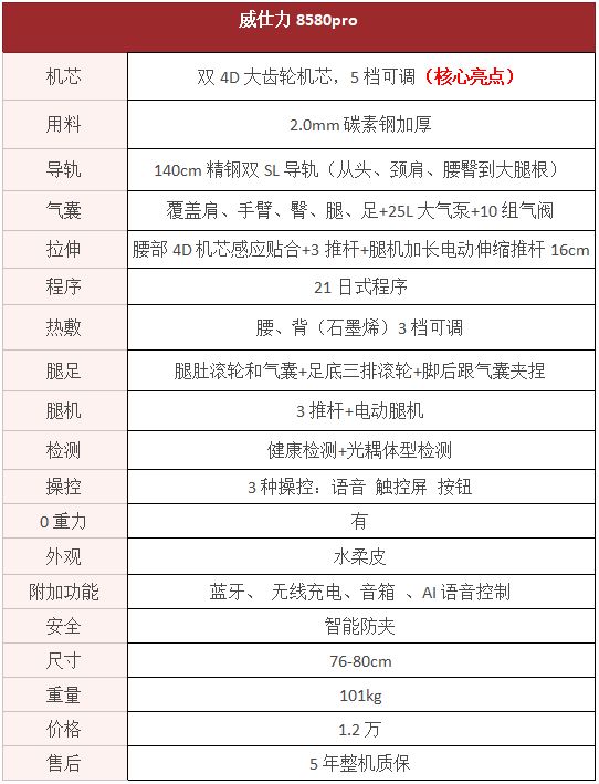 对比了这几款热门机型,可以看出威仕力整体用料都比较扎实,万元级及以上价位机芯都做到了4D齿轮机芯,用料不断加厚价款,气囊、热敷和腿足也都一直精益求精。