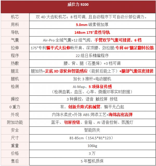 总结:很明显,威仕力9200走的是高端奢华定位,3万的价格够奢侈,配置基本拉到行业的天花板,配得上这个定位。