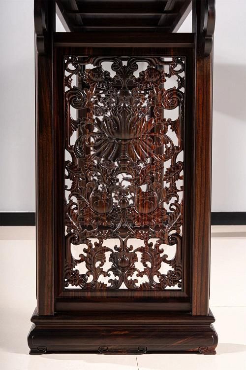 两侧腿间嵌装挡板,同样饰以双面透雕西番莲花纹,整体纹饰呼应,浑然一体,尽显雅致格调。