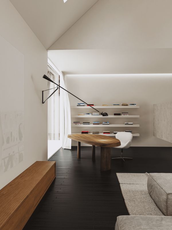 为了抵消工业感,我们引入了温暖的木质元素——例如那张具有雕塑感的实木长桌,以及低矮的悬挑地柜。这种“冷”与“暖”的对撞,承认材料的自然属性,并在冲突中寻求和谐。深色木地板则起到了视觉上更沉稳的作用,让整个轻盈的空间有了视觉重心。