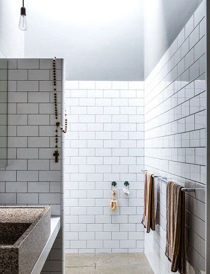 小编推荐:用矩形瓷砖,交叉式铺贴,小编并不太喜欢这个样子的铺贴方法,本来选择白色瓷砖,黑色水泥铺贴,就是强调白色色块与黑色线条的单纯性,空间划分很明确,视觉张力很好,但是这样子铺贴,反而增加里凌乱感。