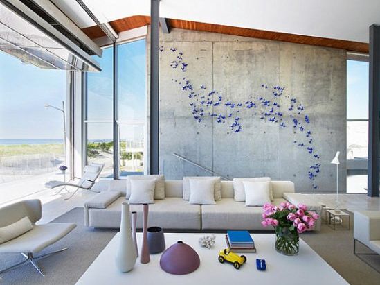 小编的话:沙发背景墙是做旧的灰色水泥墙,其上点缀着蓝色的碎花瓣,流线型的效果又十分具有轻盈感,仿佛随风飘散一般,艺术的活力彰显无遗。