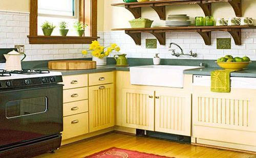 推荐理由:厨房里本来就是瓜果蔬菜的用武之地,那么把这里打扮成瓜果蔬菜的天地也未尝不可。绿色的瓶瓶罐罐如一个个新鲜的蔬菜瓜果,与真实的瓜果混在一起,也分不清谁真谁假了,黄色的橱柜与地板是你能想到的任何水果蔬菜,香蕉、芒果或是黄杏。