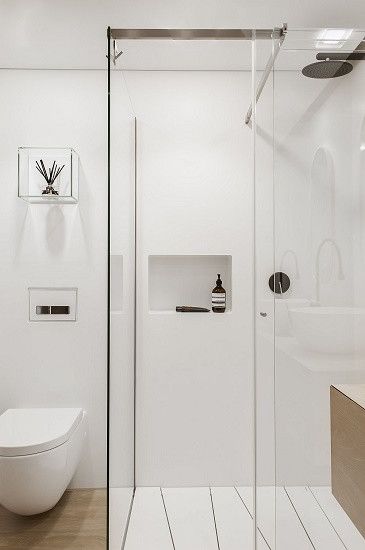 那凹形的LED灯,让干净清爽的浴室变得活跃起来。而灰色透明的活动门把浴室和卧室区隔开来,让浴室变得独立起来。