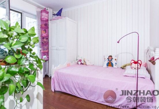 运用粉色的竖条壁纸及粉色的墙漆搭配装饰儿童房的墙体,圆了女孩的童话梦,同时避免了墙面的单调性,窗帘的上方条纹与壁纸的呼应体现了设计的统一性,下方的粉色小碎花表现了女儿爱美的心理。