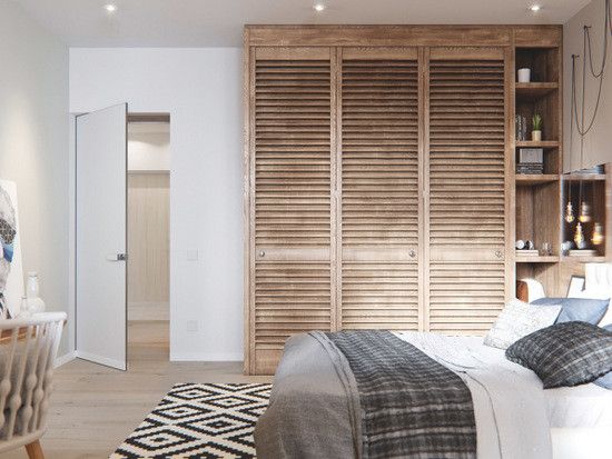 卧室利用回收的木质衣柜营造出复古气息,黑白几何形状的地毯,镜面背景墙带来对比鲜明的时尚感,文化石,装饰画,轻松提升空间的格调。