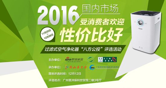 为了提高消费者对空净产品的认知和消费积极性,促进我国空净产业和消费市场沿着正确的轨道健康发展,由新浪家居和中国室内环境净化行业联盟联合主办,广东省室内环境卫生行业协会、广东省南山发展基金会联合承办的“受消费者欢迎、性价比好”的空气净化器Top30/Top10评选活动将于2016年12月12日在广州琶洲保利世贸馆举办,在2016年11月20日——12月06日,在全国范围内开展(2016)国内市场“受消费者欢迎、性价比好”的过滤式空气净化器网络评选活动。